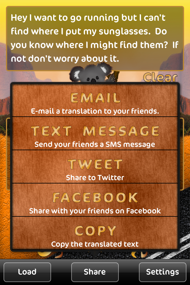- Share your translations with your friends instantly through E-mail, SMS (text message), Facebook, or your own messaging application