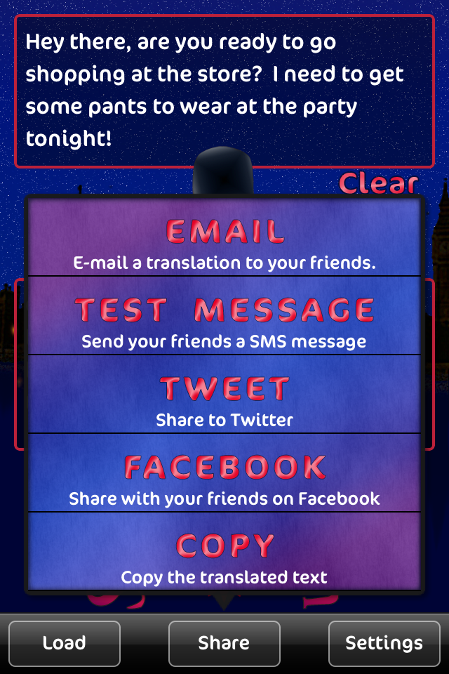 - Share your translations with your friends instantly through E-mail, SMS (text message), Facebook, or your own messaging application