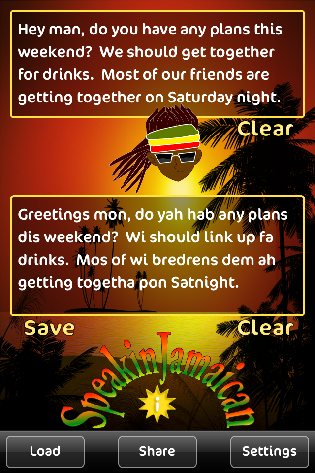 Wa'ppun? Welcome ta Speakin Jamaican! Dis app be cris & easy to use mon, type a message and translate it in the tap of a button then send it ta all your bredren. Truss mi, dis app will leave you feelin so upful, use it to channel your inner Rastafarian, humor your breddas, or satisfy your curiosity about the Jamaican language!