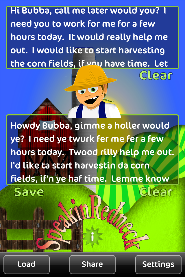 Well Howdy Thar! Speakin Redneck allows you to send messages to your friends by adding some hillbilly twang. You might be a Speakin Redneck after using this great translator! Pronounce Redneck words or phrases and get your friends laughing by sending them fun and unique messages with Speakin Redneck.