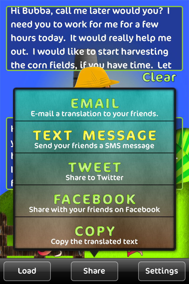 - Share your translations with your friends instantly through E-mail, SMS (text message), Facebook, or your own messaging application