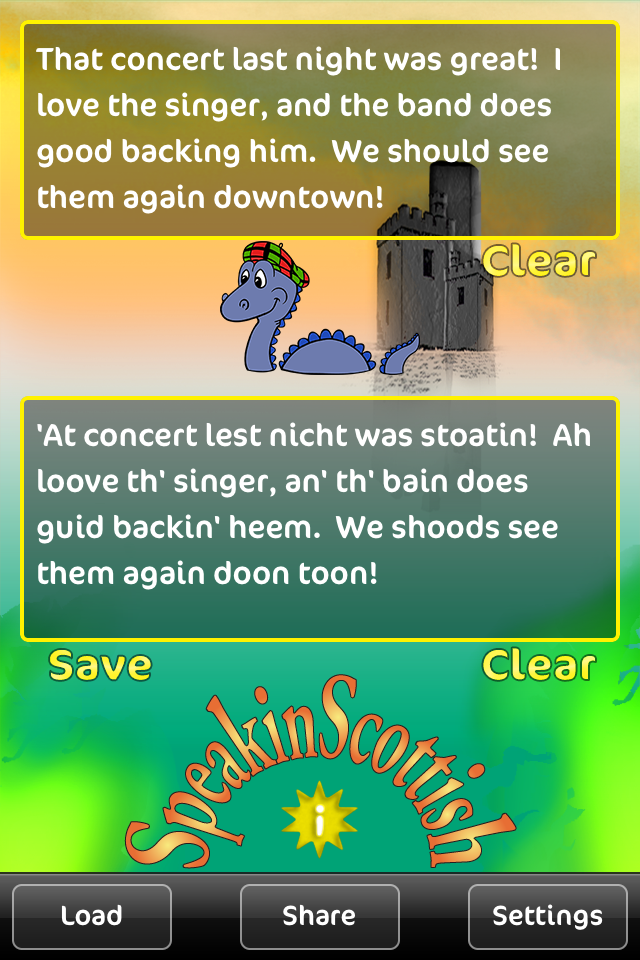 Whether you are daffing around with your friends or want to add a Scottish lilt to your messages, use this app to learn to speak like the Scottish! Simply enter a word or phrase, translate it in the tap of a button and instantly share it to any of your friends. So, tighten your tartan, grab your bagpipes and get ready to start bleth'rin like the Highlander.