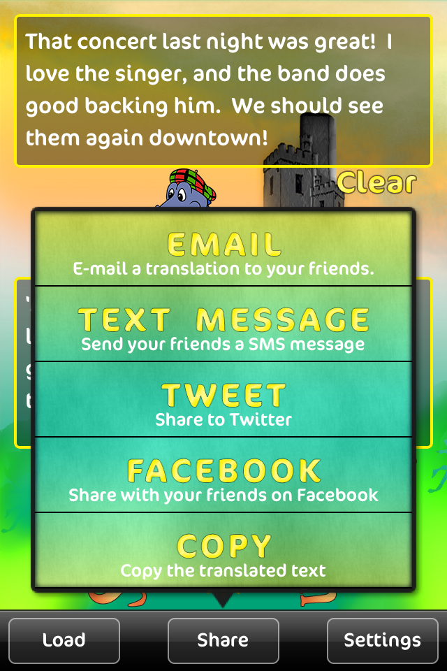 - Share your translations with your friends instantly through E-mail, SMS (text message), Facebook, or your own messaging application
