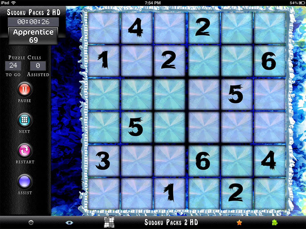 Sudoku Packs 2 HD features 600 handpicked Sudoku puzzles expanding six progressive difficulty packs. Sudoku Packs 2 HD is an exhilarating and challenging game for both novice and experienced players. You can play the classic 9 x 9 puzzle grids or venture your way through each puzzle pack.
